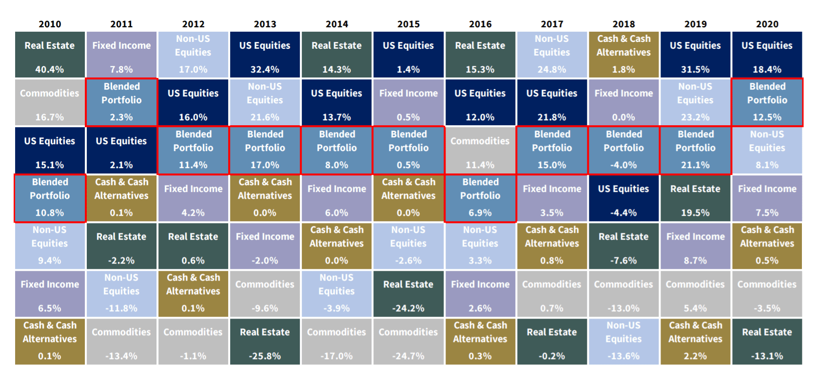 The best-performing asset class often changes from year to year, and the difference between the best- and worst-performing in any year can be significant. Here’s a look at how major asset classes performed compared to a diversified, blended portfolio in each of the last 10 years.
